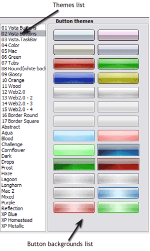 In the Themes toolbox you can choose selected buttons for web appearance. Click theme name to open it. The theme's available button backgrounds will appear in the Button backgrounds list.
